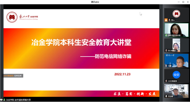 11月23日,冶金学院举办“安全教育大讲堂—防范电信网络诈骗”本科生专场线上专题报告会。冶金学院党委副书记兼副院长吕志娟、公安处教育信息科科长宋小艳,学院本科生辅导员及全体本科生班长、寝室长共计300人参加报告会。