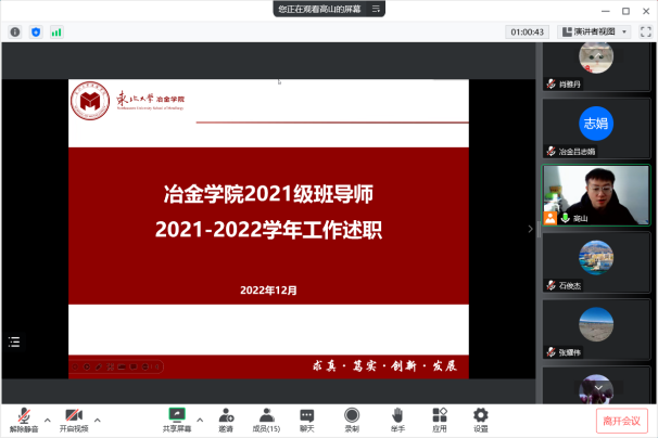 近期,冶金学院分年级召开2021-2022学年班导师述职考核互评会,学院2018-2021级共64位班导师参加述职互评,学院党委书记张耀伟、党委副书记吕志娟参加会议,各年级辅导员主持会议。