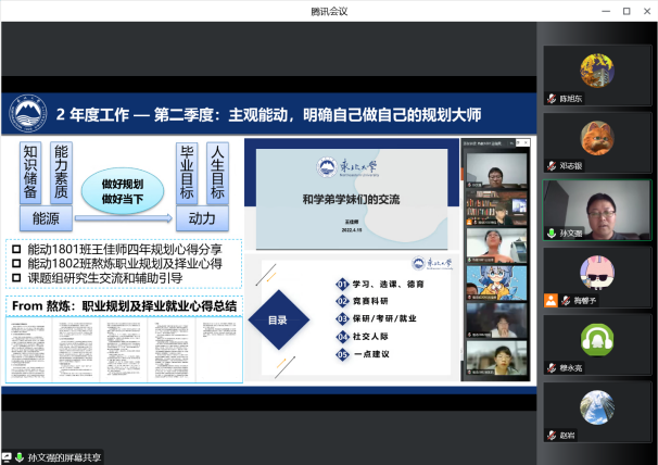 原2018级班导师分别围绕考研与就业动员指导工作、升学心理调适工作、毕业设计指导工作、感恩母校“最后一次班会”等内容展开述职。班导师重点介绍2022届本科毕业生的毕业去向,以及为就业困难学生提供全方位指导和帮助的方式方法,助力学生顺利就业。