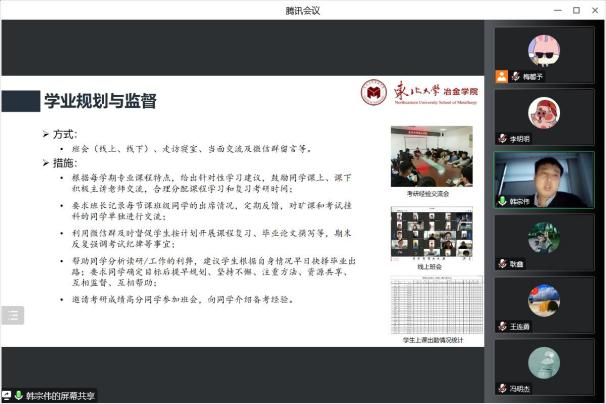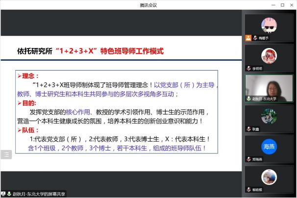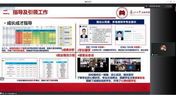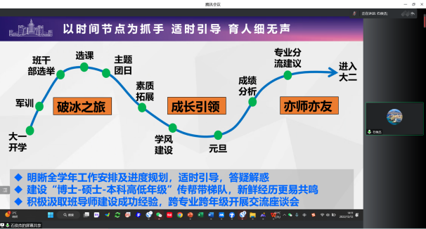 会上,各位班导师围绕2021-2022学年特色工作和日常工作展开述职,主要从思想引领、安全管理、疫情防控、班级文化建设、学业指导以及重点群体帮扶等方面内容对本学年各项工作进行总结汇报。