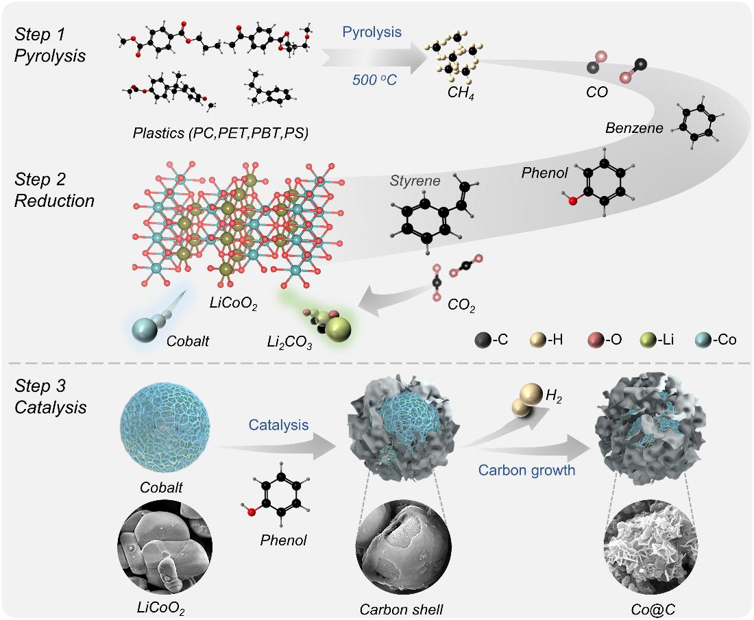 新能源产业的发展亟需大量锂离子电池,退役锂离子电池会造成环境污染和资源浪费。针对上述问题,尹华意团队提出了利用废弃塑料作为还原剂回收退役锂离子电池的策略,旨在开发一种高效绿色的回收锂离子电池正极材料和含苯塑料的清洁路径。该工作利用密闭反应釜协同热解和还原工艺,将含苯塑料热解气作为还原剂还原破坏锂电池正极的晶体结构,被还原的锂电正极材料同时作为催化剂催化含苯废气的高效降解,实现了协同回收锂电正极材料与含苯废弃塑料(如图1)。