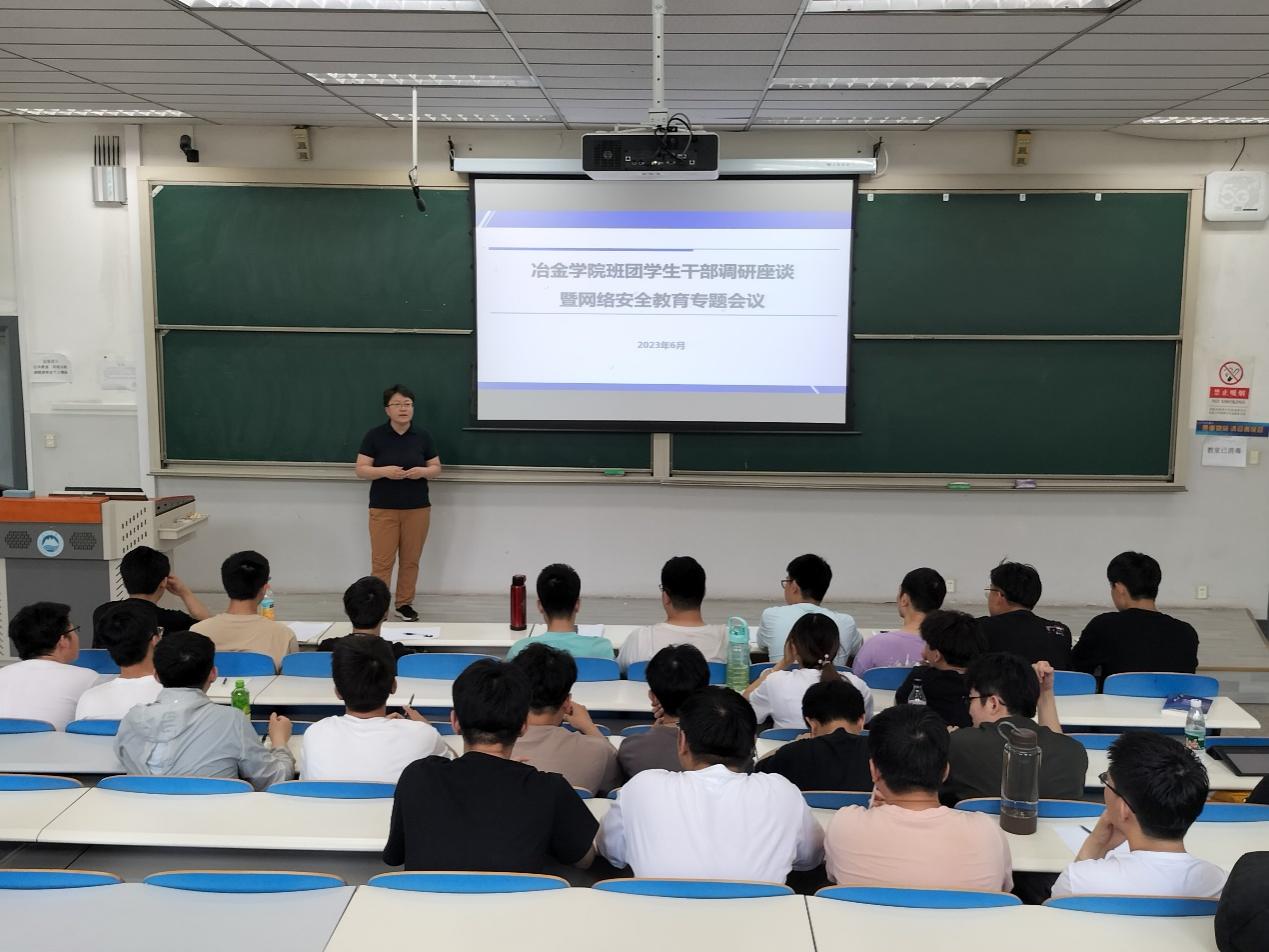 6月16日,冶金学院在逸夫楼107室召开班团干部调研座谈暨网络安全教育专题会议,学院学生工作干部、本科生班长和团支书共计100余人参加会议。会议由学院党委副书记、副院长(兼)吕志娟主持。