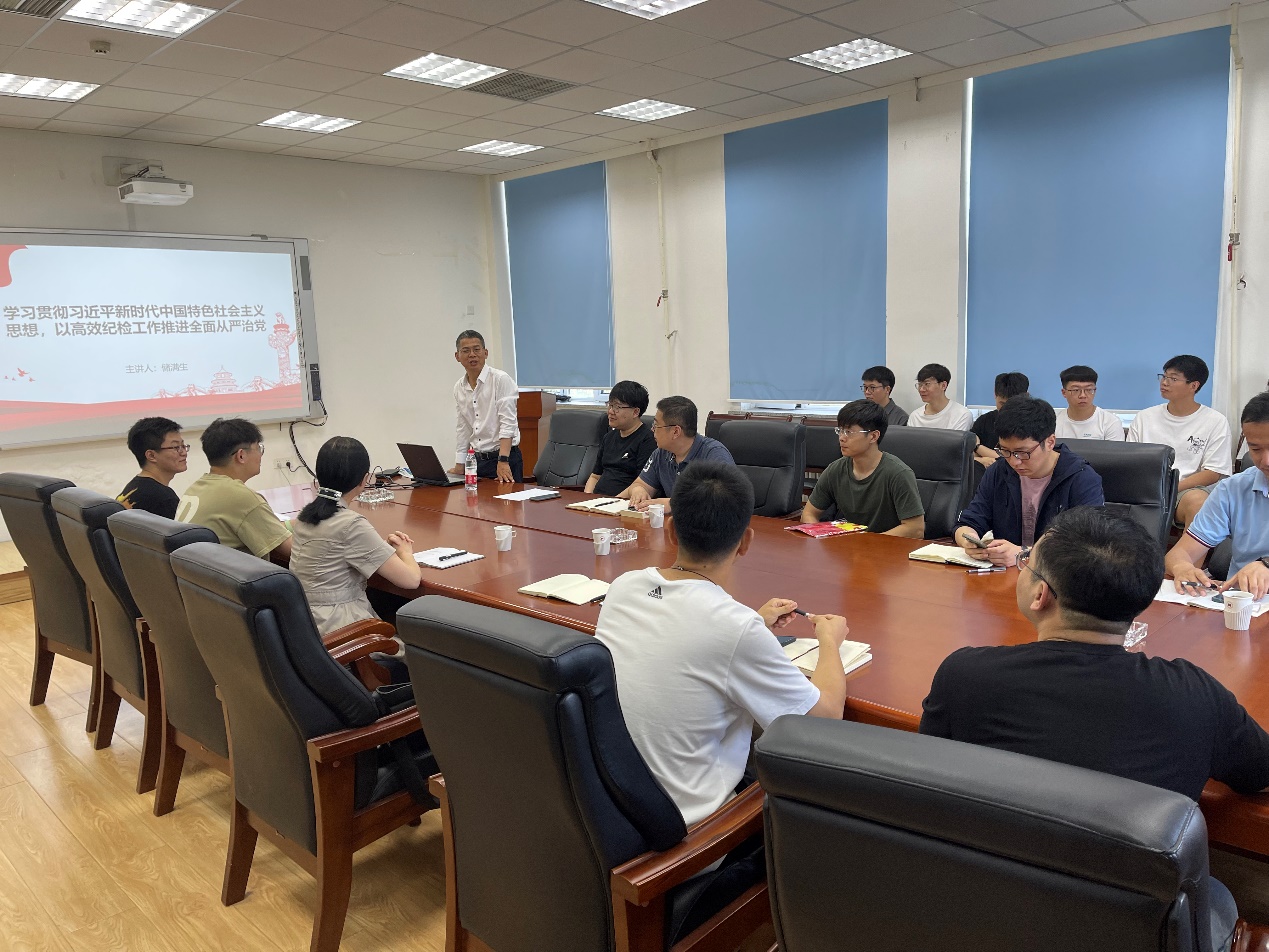 储满生分享了他的学习心得,讲述了用习近平新时代中国特色社会主义思想武装全党的重大意义,带领大家学习了习近平新时代中国特色社会主义思想的主要内容;同时,结合纪检工作实际,储满生介绍了习近平新时代中国特色社会主义思想关于全面从严治党的重要论述以及高校基层全面从严治党难点及纪检工作要务,并督促大家认真学习习近平新时代中国特色社会主义思想的精髓与内涵,做到学活、学透、学以致用。