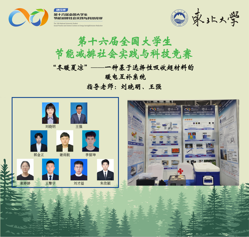 本届大赛以“节能减排、绿色能源”为主题、紧密围绕国家“双碳政策”,吸引来自全国638所高校,共5万余名师生报名参赛,有效作品总数6852件,创大赛历史新高。其中,由材料电磁过程研究教育部重点实验室刘晓明、王强老师指导,新能源科学与工程、能源与动力工程专业郭金正、谢雨航、李留坤、索婷婷、刘才溢、朱欣颖等同学完成的作品《“冬暖夏凉”——一种基于选择性吸收超材料的暖电互补系统》首获一等奖。