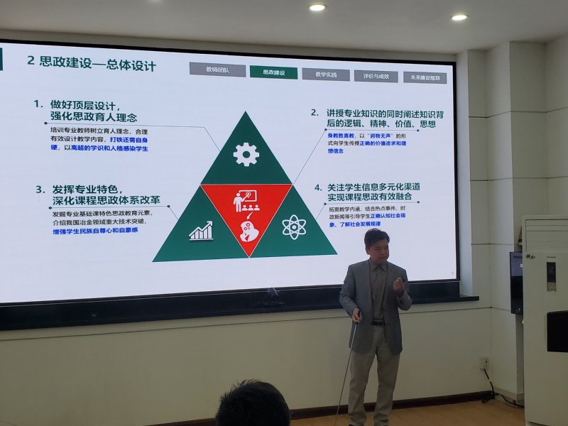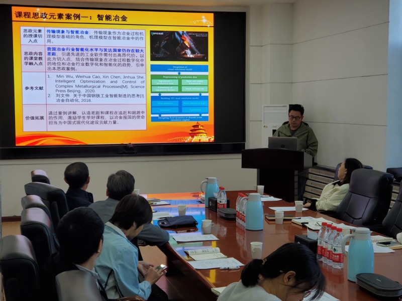 研讨会上,《数值传热学》课程负责人于庆波、《过程冶金传输现象》主讲教师邵磊、《冶金物理化学》课程负责人沈峰满、《工业生态学》课程负责人杜涛、《中华冶金发展史》主讲教师亓捷、《金属凝固》主讲教师王卫领等六名校级课程思政示范课老师给参会人员做了精彩的课程思政示范课建设成果报告。教学科研办公室杨澈在会上做了《厚育人基础、重教学设计》课程思政学习心得分享。