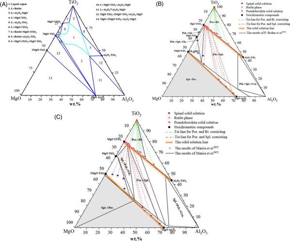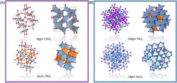 含钛高炉渣是钒钛磁铁矿高炉冶炼的副产物,其所含钛氧化物质量分数高达20%以上,是重要的二次资源。为实现渣中钛组分的高效提取,须明确含钛渣系高温结晶及矿相重构过程,而目前与之相关的相平衡热力学基础数据极度匮乏,导致钛资源高效提取工艺的开发缺乏针对性指导。为此,针对CaO-SiO2-MgO-Al2O3-TiOx-MeOy(Me=Zr, P, Cr等)含钛多元氧化物体系熔化温度、相平衡关系、固溶体成分、钛组分赋存价态和赋存物相等热力学性质,研究团队历经多年研究,将热丝法熔化析晶性能测定、高温相平衡实验与计算相图等方法有机结合,系统建立了含钛渣系核心氧化物体系高温平衡相图,填补了该领域相平衡热力学研究空白。截止目前,研究团队在该领域已发表多篇高水平学术论文,大部分研究成果被美国陶瓷协会旗下《Phase Equilibria Diagrams Version 5.0》热力学软件收录。在该获奖论文中,研究团队与企业联合攻关,针对选择性析出与结晶工艺中富钛相平衡热力学信息的不足,建立了MgO-Al2O3-TiO2核心含钛体系1600°C等温截面图,阐明了板钛矿和尖晶石固溶体的形成机理,为含钛高炉渣钛组元提取、含钛陶瓷制品开发等提供了关键基础热力学数据。