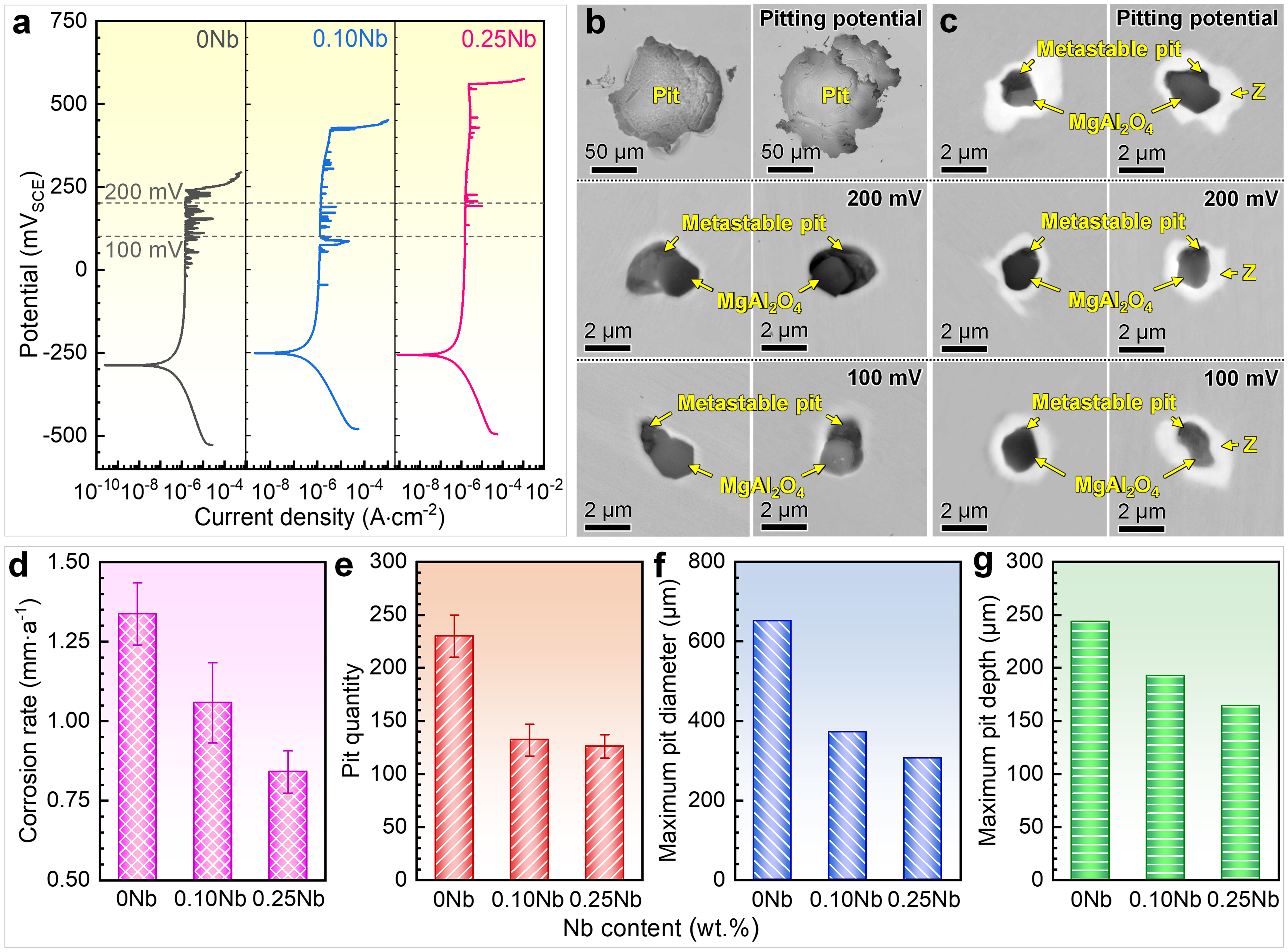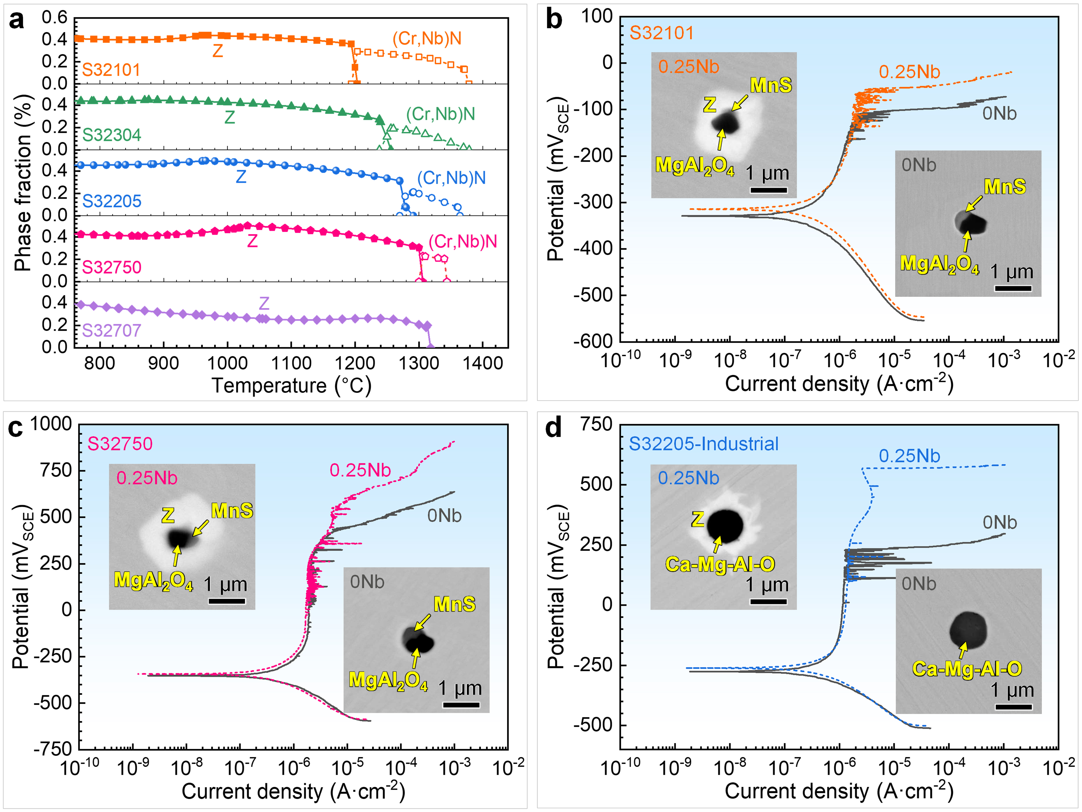 图3 含铌Z相包裹夹杂物改善耐蚀性策略的普适性验证(b-d腐蚀环境:72℃两倍浓度海水)