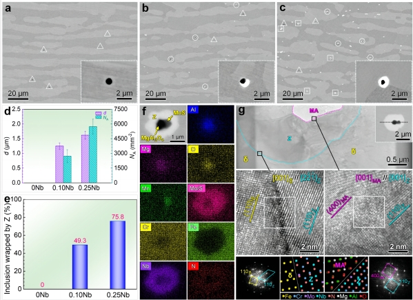图3 含铌Z相包裹夹杂物改善耐蚀性策略的普适性验证(b-d腐蚀环境:72℃两倍浓度海水)