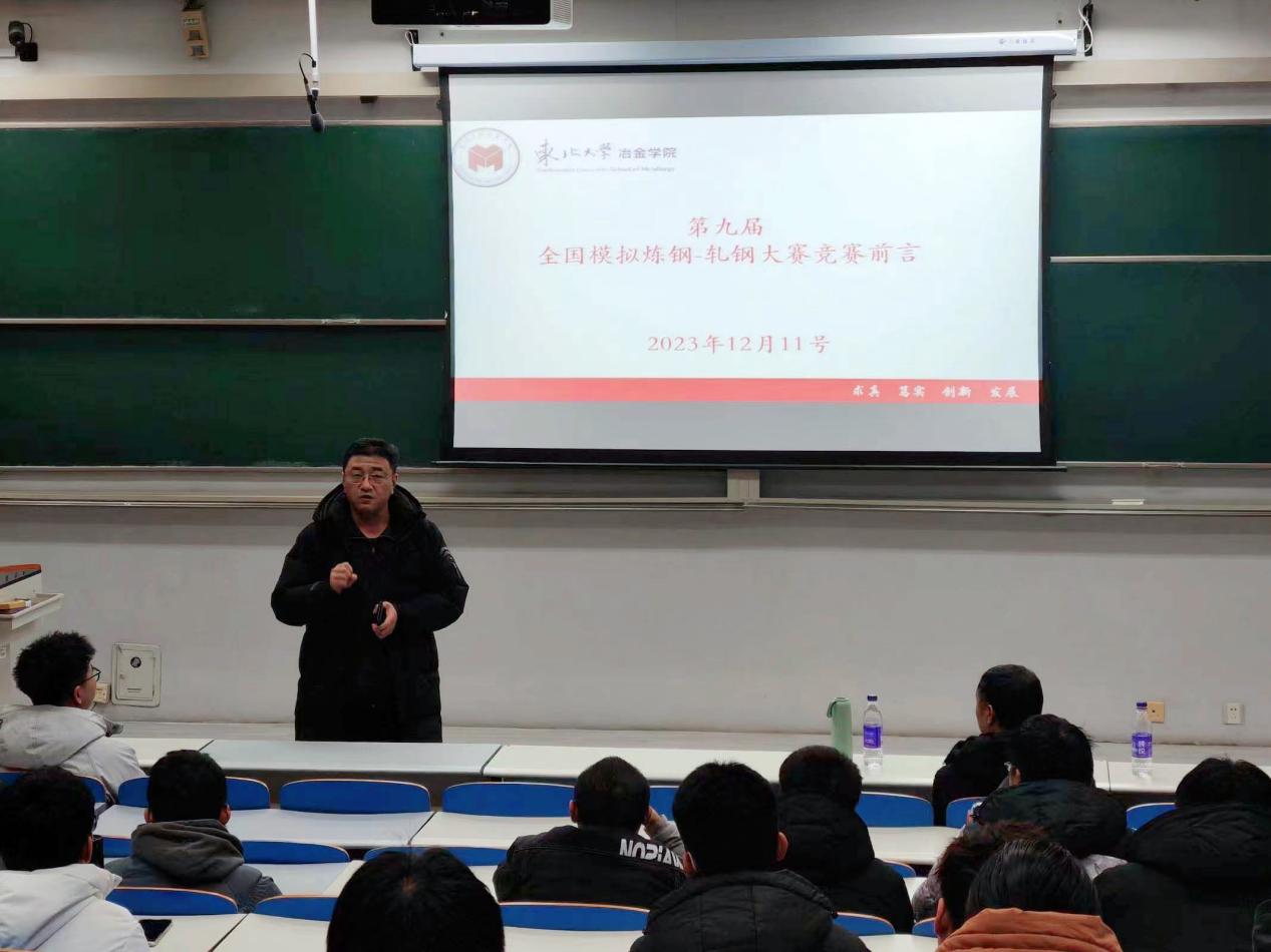 12月11日,第九届全国模拟炼钢-轧钢大赛东北大学校内赛赛前讲座在逸夫楼105教室举行。冶金学院特殊钢冶金研究所战东平教授,材料科学与工程学院材料加工系唐正友教授受邀作为主讲人,讲座由冶金学院双创辅导员高山主持,一百余名同学参加。