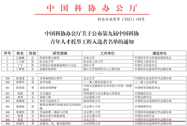 近日,第九届中国科协青年人才托举工程入选名单公布,本批次共有来自全国高校和科研单位的752名青年科技人才入选(不包含特殊科技领域入选者),其中冶金领域共10名,我院特殊冶金与过程工程研究所青年教师张蕊入选。