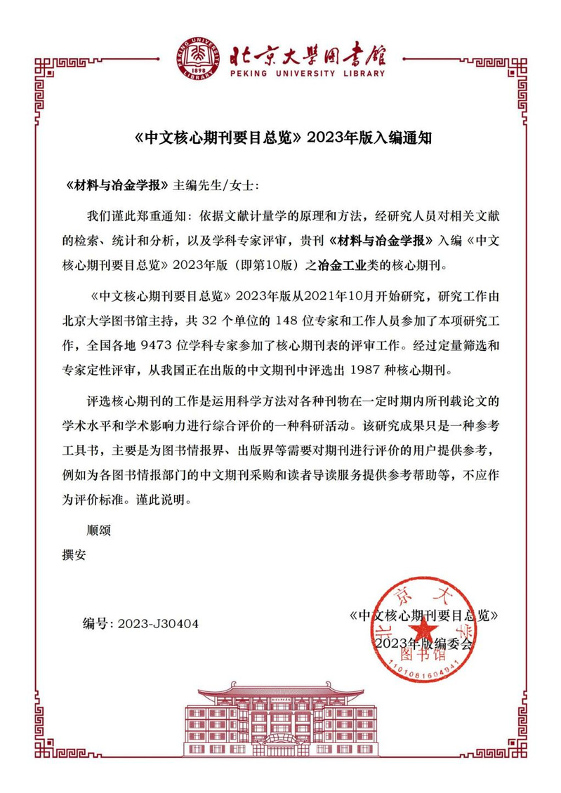 近日,北京大学图书馆发布了2023年版(第10版),《材料与冶金学报》再次入编《中文核心期刊要目总览》之冶金工业类的核心期刊,这是本刊继2011年版(第6版)、2014年版(第7版)、2017年版(第8版)和2020年版(第9版)后再次入选中文核心期刊。