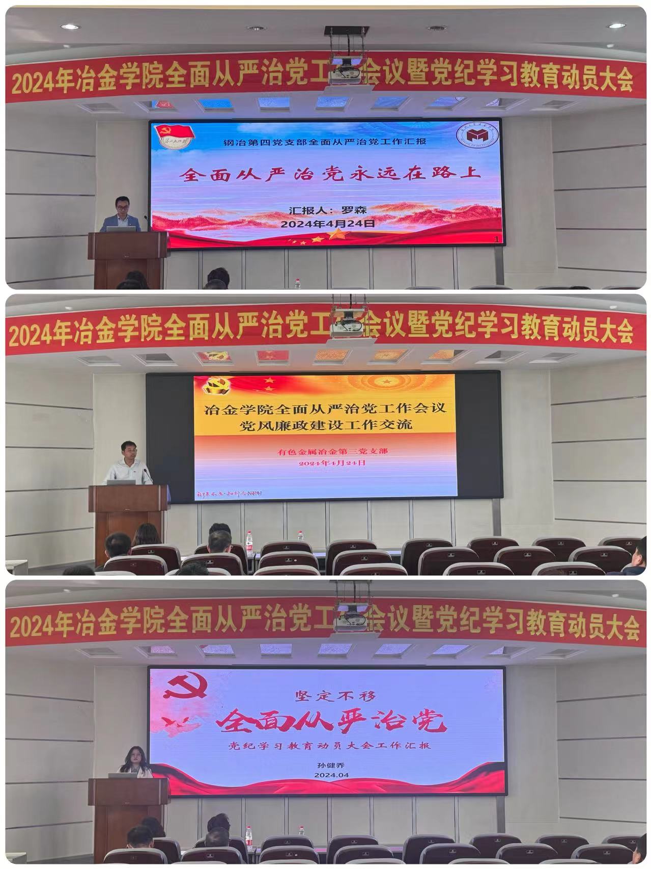 钢铁冶金第四党支部、有色金属冶金第三党支部、学生工作办公室党支部就基层党组织落实全面从严治党工作要求、开展党风廉政建设工作情况进行了汇报,向各党支部、各基层组织交流分享了工作经验。纪委委员段文军领学了《中国共产党党员网络行为规定》。