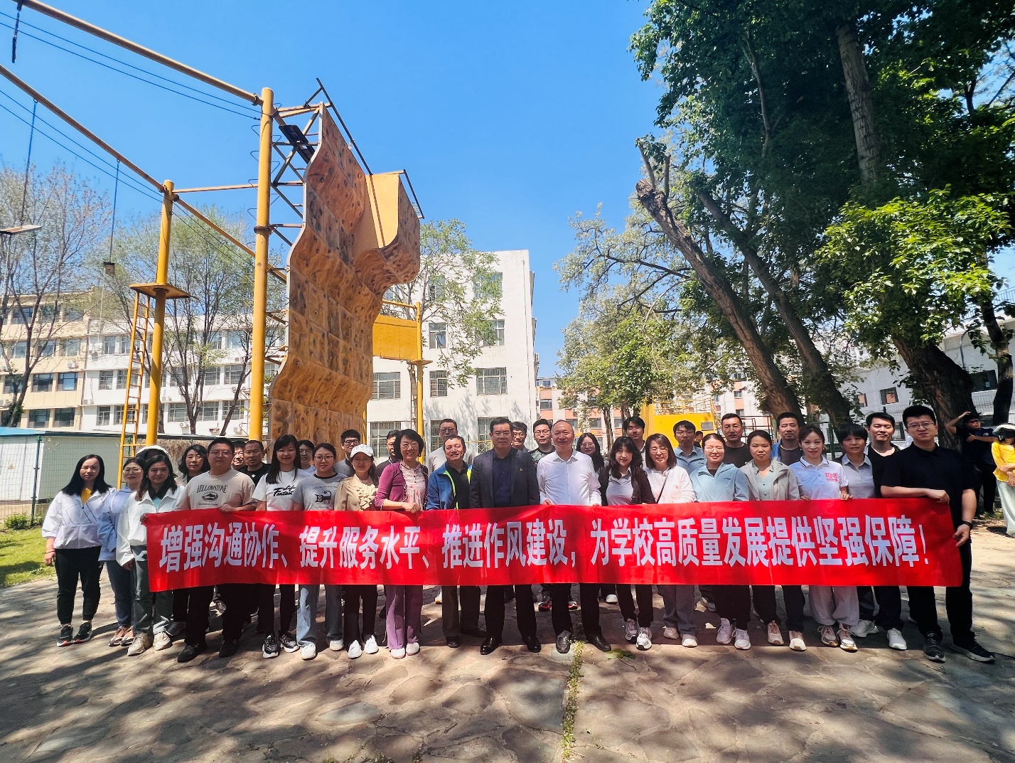 为有效贯彻落实《东北大学“机关作风建设年”工作实施方案》,进一步提升机关管理服务水平,增强团队协作精神和凝聚力,促进机关各部门与学院的交流,5月8日中午冶金学院工会和机关工会在学校拓展训练场地组织开展教职工拓展训练交流活动。