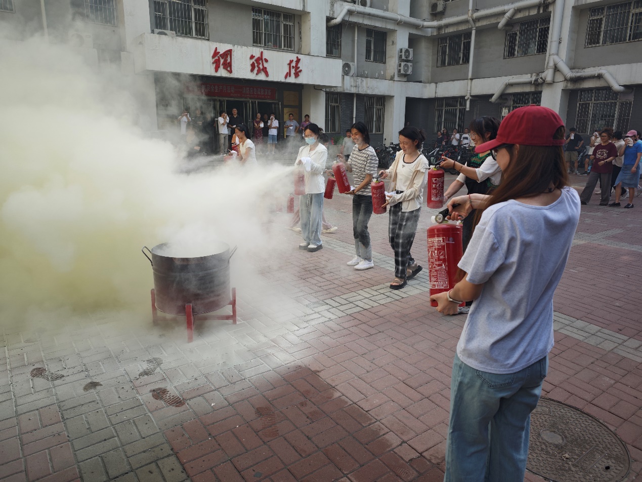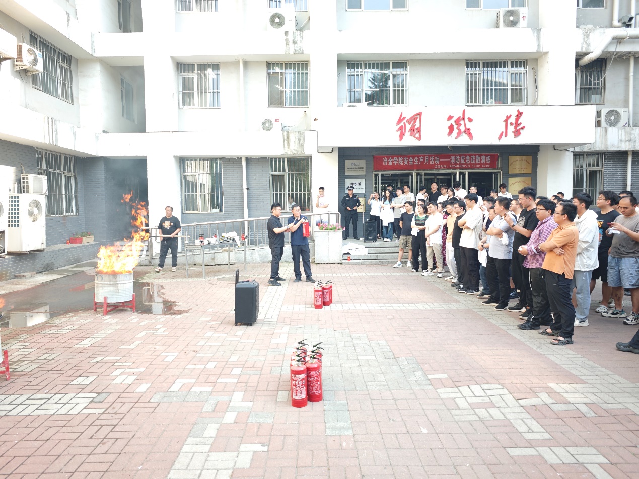 疏散逃生演练结束后,学校公安处消防科周挺在钢铁楼门前为全体师生讲解了灭火器、消火栓等消防器材的操作和使用方法,全体师生进行了现场操作。