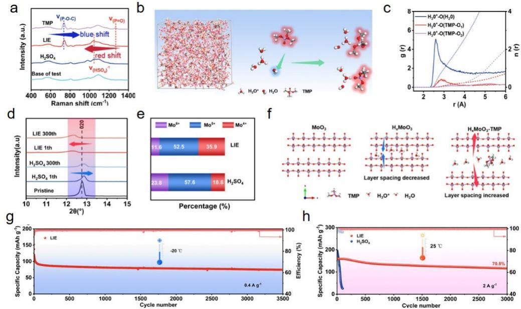 该团队提出了一种可实现层间插入的电解液,实现了水系质子电池的稳定运行。通过在典型的硫酸水溶液中引入磷酸三甲酯,构建了复杂的氢键网络,稳定了电解液主体和电极材料界面,提升了电池在常温和低温下的稳定性。同时实现了溶剂分子在电极材料的层间插入,拓宽了离子传输通道,增加了电荷储存密度。