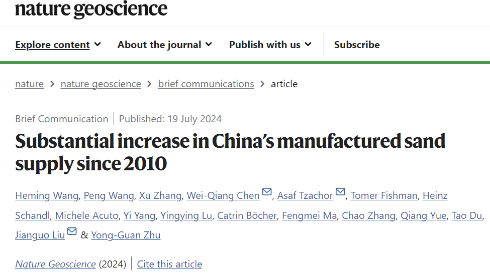 论文详细信息:Heming Wang#, Peng Wang#, Xu Zhang#, Wei-Qiang Chen*, Asaf Tzachor*, Tomer Fishman, Heinz Schandl, Michele Acuto, Yi Yang, Yingying Lu, Catrin Böcher, Fengmei Ma, Chao Zhang, Qiang Yue, Tao Du, Jianguo Liu* & Yong-Guan Zhu. Substantial Increase in China’s Manufactured Sand Supply since 2010. Nature Geoscience. 2024. https://doi.org/10.1038/s41561-024-01501-6.
