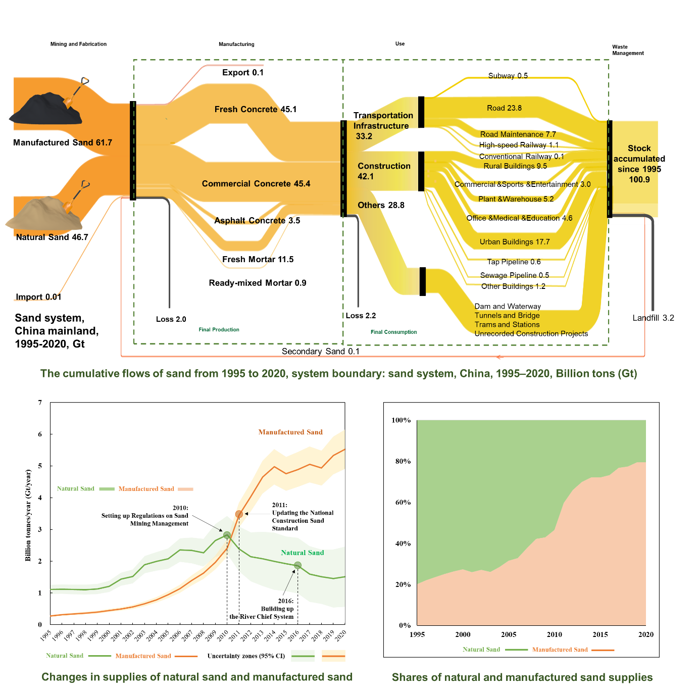 针对上述挑战,该研究团队率先构建了砂子全过程资源流动的监测框架,通过集成多源数据,完成了1995-2020年中国砂子资源流动的精细化追踪。研究发现,为应对天然砂供应短缺及其带来的严重生态环境问题,中国通过供给侧的“天然砂开采管控”及消费侧的“机制砂应用推广”,彻底逆转了中国砂子的供应结构,其中天然砂消费自2010年达峰之后快速下降,同时机制砂占比由20%快速上升至80%左右,从而实现了由天然砂向机制砂的战略转型。这项研究将为世界各国,尤其是发展中国家应对“天然砂短缺危机”提供重要参考和借鉴。该研究工作得到了国家自然科学基金和中国科学院先导项目等的支持。