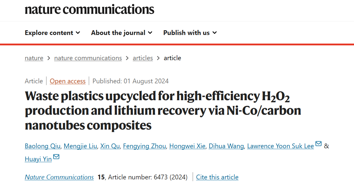 近日,东北大学冶金学院联合香港理工大学和武汉大学在锂离子电池回收及升级利用方面取得新进展,相关成果“Waste plastics upcycled for high-efficiency H2O2 production and lithium recovery via Ni-Co/carbon nanotubes composites”在《自然通讯》 (Nature Communications)期刊上发表。东北大学2021级博士生邱保龙、香港理工大学刘梦洁为论文共同第一作者,东北大学为第一完成单位,通讯作者为东北大学尹华意教授,香港理工大学Lawrence Yoon Suk Lee教授。