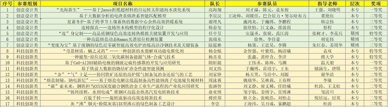 经作品初评、专家会评、决赛答辩等环节,学院张树才、李花兵老师指导作品《“连”身定制——高品质钢绿色高效连铸热模拟关键装置开发与应用》获得创意设计竞赛单元特等奖;学院袁双老师指导作品《“奇思材质,熵之灵药”——一种创新的水裂解双功能电催化剂》,傅大学老师指导作品《一种捕集-原位还原二氧化碳制备能源气体-合成气技术》,冯浩、李花兵老师指导作品《高氮不锈钢加压电渣重熔高效脱硫控铝技术》,朱红春、李花兵老师指导作品《加压凝固与合金优化协同的高航空轴承钢提质和减排新策略》,胡宪伟老师指导作品《熔盐电解硫化铝制备金属铝基础研究》等五项作品获得科技创新竞赛单元特等奖;学院谢锋、茹家胜老师指导队伍和符岩、金哲男老师指导队伍获得仿真实训竞赛单元火法炼铜特等奖。