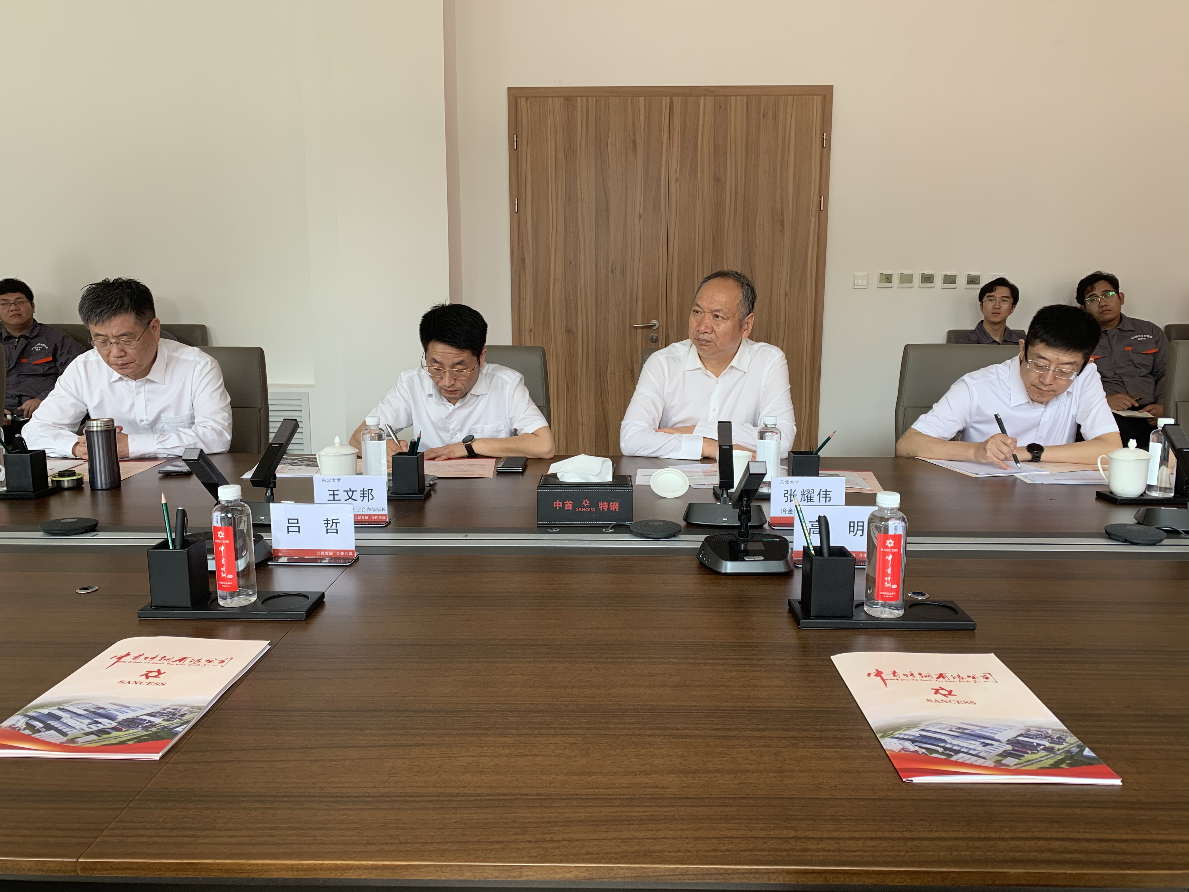 8月18日,东北大学与河北省中首特钢集团有限公司举行校企合作签约揭牌仪式,双方将共同建设“绿色智能特殊钢技术协同创新中心”。滦州市委常委、常务副市长高明,滦州市政府三级调研员吕哲,滦州市发展和改革局局长杨海卿,中首特钢董事长郑廷文、副董事长李连政、总经理于建水,东北大学冶金学院党委书记张耀伟,东北大学科学技术研究院工业合作部部长王文邦,东北大学特殊钢先进冶金工业与装备教育部工程研究中心主任、绿色智能特殊钢冶金研究中心主任姜周华等人参与签约揭牌仪式。