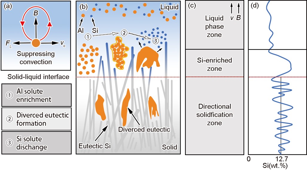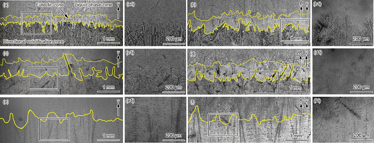 共晶合金作为重要的金属材料,其性能主要由凝固组织决定。研究团队在有无强磁场和不同凝固速率条件下进行了Al-12.7%Si (质量分数)共晶合金的定向凝固和淬火实验,考察了磁场和凝固速率对合金定向凝固组织及溶质迁移行为的影响。结果表明,Al-12.7%Si共晶合金随着凝固速率的增加,发生了从粗大共晶向细小共晶、再向亚共晶组织的转变。而在相同凝固速率下,施加强磁场同样可以诱发上述组织演变。