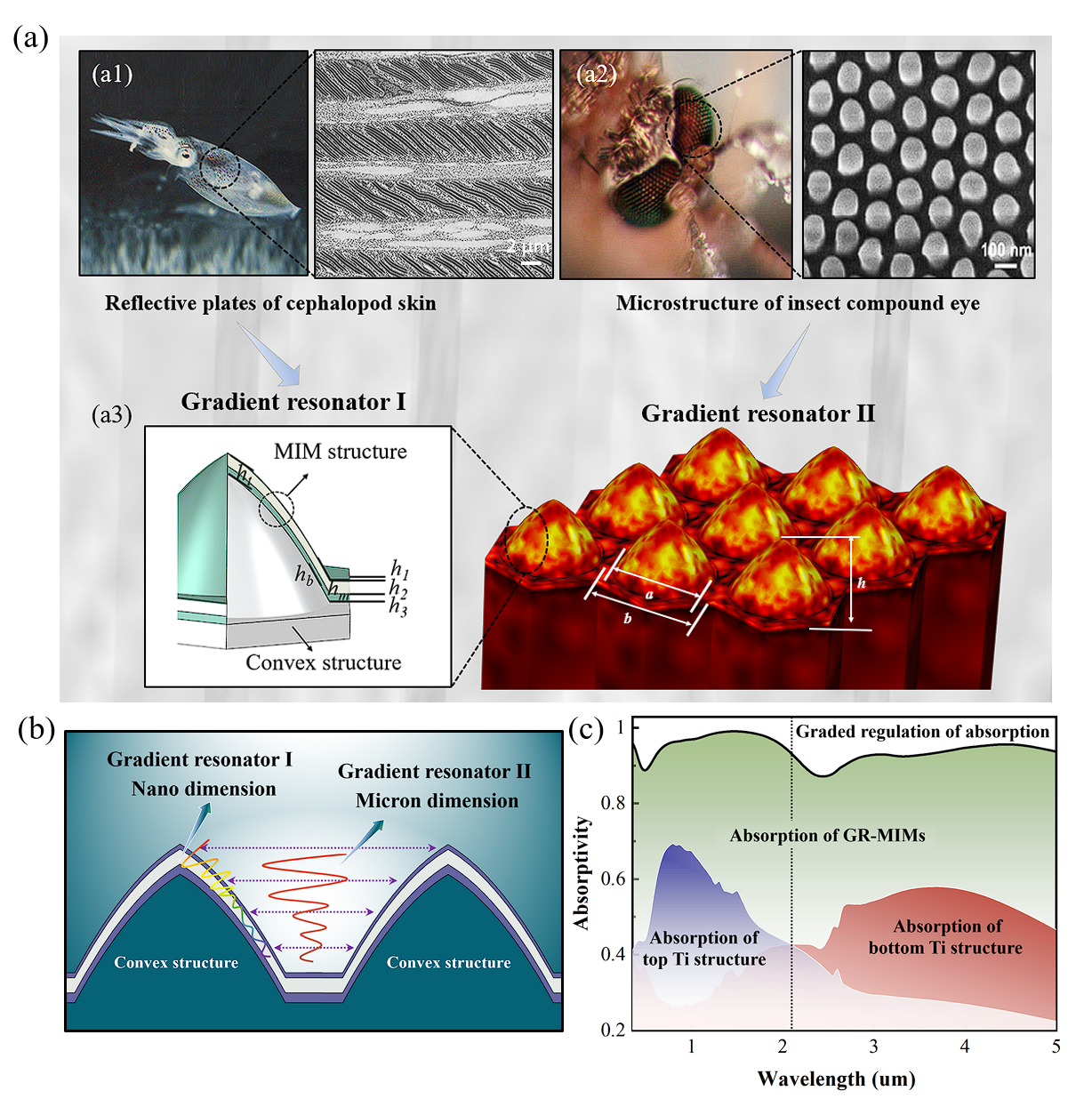 王强教授团队提出了一种梯度谐振器的MIM超材料(GR-MIMs)设计概念,通过仿生结构耦合形成微纳两种维度的梯度谐振器结构,突破了超材料设计中不同谐振单元数量上的限制,将“共振点”转化为“共振带”,实现了谐振单元共振频率的连续响应(图2)。通过对MIM结构梯度化设计,200 nm厚的GR-MIMs在0.2~5 μm波段平均吸收率高达93%,展现出优异的宽频吸波性能。由于GR-MIMs的中心对称和强侧向散射机制,GR-MIMs实现了宽入射角度和极化不敏感吸收的光谱特性。GR-MIMs吸收体的太阳光谱吸收率可达94.5%,在太阳能利用,海水淡化,光热除冰等领域具有广阔的应用前景。