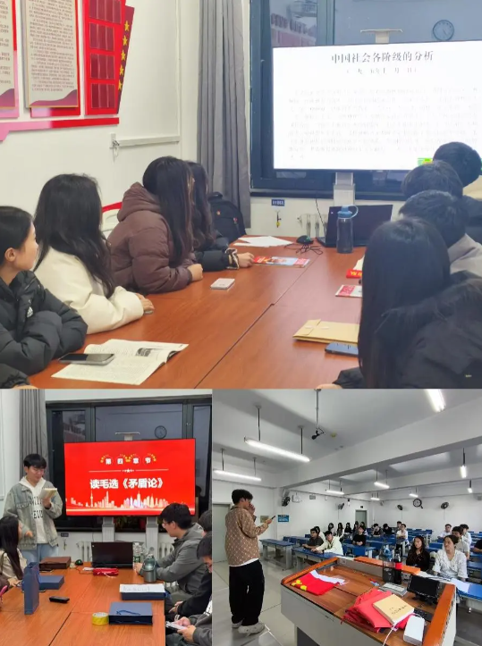 本学期党支部共开展3次阅读《毛泽东选集》活动,由支部党员为大家朗诵相关篇目并分享思考和感悟。党员们积极参与,理性讨论,认真学习了《反对本本主义》《中国社会各阶级的分析》《矛盾论》三篇文章。通过参与特色活动,党员们对毛泽东思想有了进一步的了解和认识,加深了对党的指导思想和人民史观的理解与认同。在讨论中对如何在学习生活中运用毛泽东思想有所探讨,一致认为要经过调查研究再发表观点,用发展的眼光看待问题,用辩证的思路分析问题。