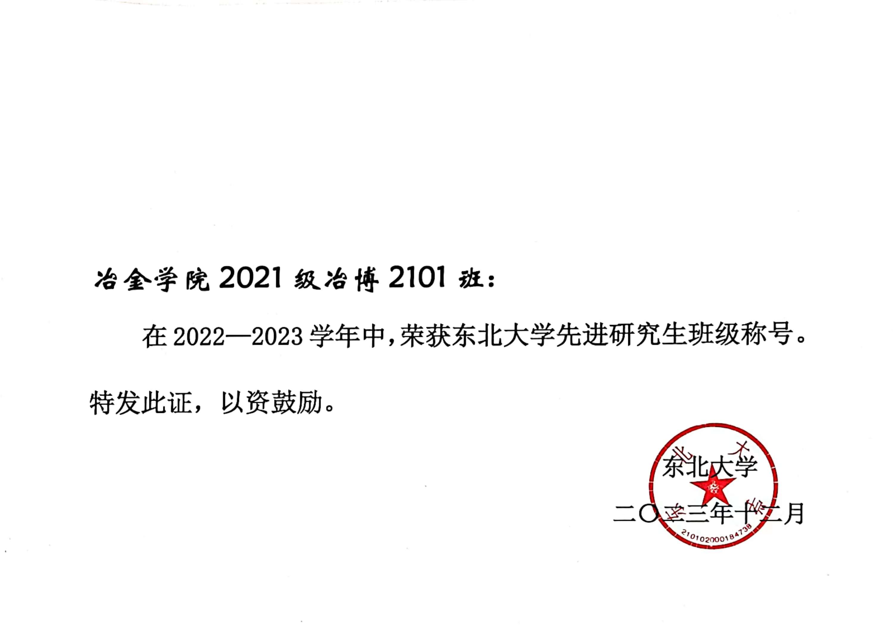 冶博2101班由45位怀揣梦想、勇于担当的同学组成,他们传承冶金学院爱国主义的光荣传统,扎根大冶金学科专业群,为“人才兴国”和“东北振兴”贡献着自己的力量。在全体同学的不懈努力下,冶博2101班于2022-2023学年获评“东北大学先进研究生班级”荣誉称号。
