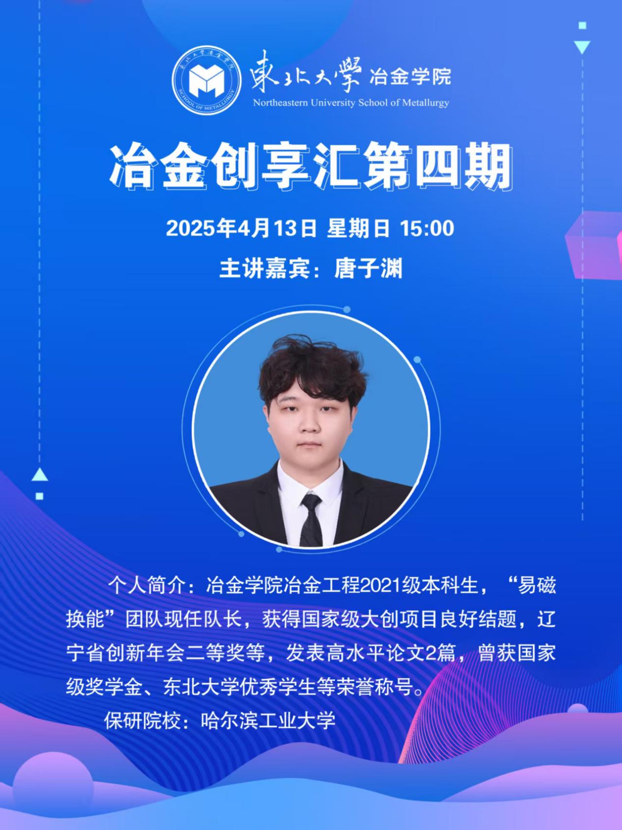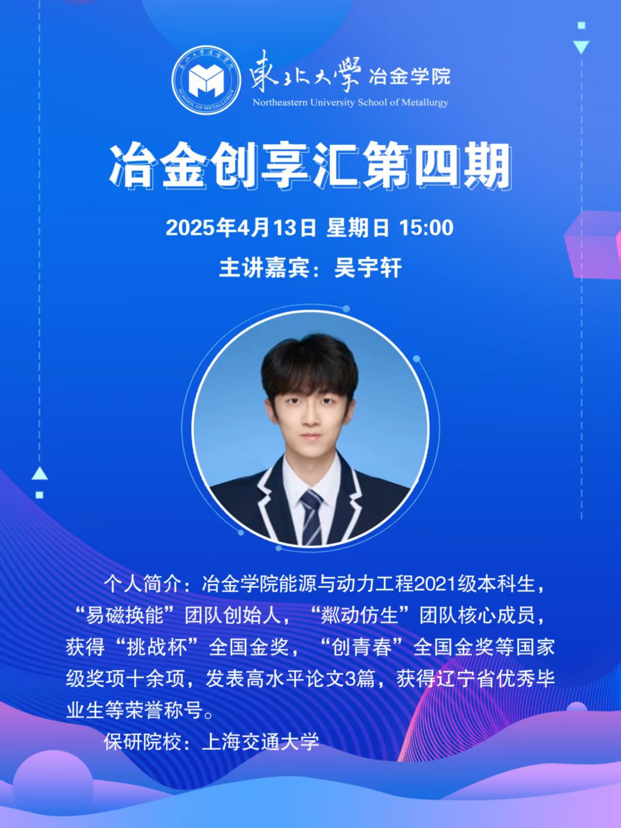 最近有很多同学对于如何跨学院、跨学科寻找合适团队、发掘自身兴趣提出了疑问。那么,我们可以怎么做呢?冶金科协将于4月13日(周日)下午举办冶金创享汇第四期——“易磁换能”团队与“粼动仿生”团队跨学科经验交流分享会。在本期创享汇中,你能够学到如何进行多学科融合的创新创业,帮你找准在跨学科团队中的角色,发挥专业优势,实现高效协作,可以了解到如何从选题挖掘创新点,到整合资源推进,再到成果转化,剖析完整流程。同时你也可以与优秀的团队和学长学姐面对面交流,了解他们是如何进行跨学科融合,取得成功。不仅如此,在这里你还可以与其他同学交流想法,寻找共鸣,找到那些对你想法感兴趣、且拥有不同专业技能的伙伴,一起组建一个多元化的团队。