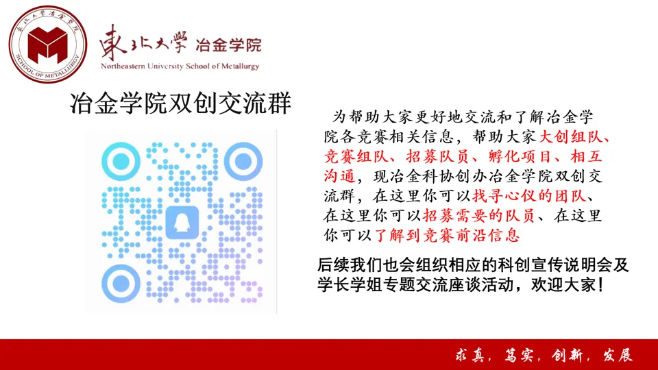 记得早点到场抢占好位置哦!不然你可能会错过有趣的故事。希望大家都能在这次活动中收获满满。让我们共同期待,在未来参加竞赛时,我们都能以更充分的准备,迎接挑战,创造辉煌!期待与你们的见面!请大家加入冶金双创群,冶金创享汇活动证明将在此发放,后续系列活动将在群内宣传通知。