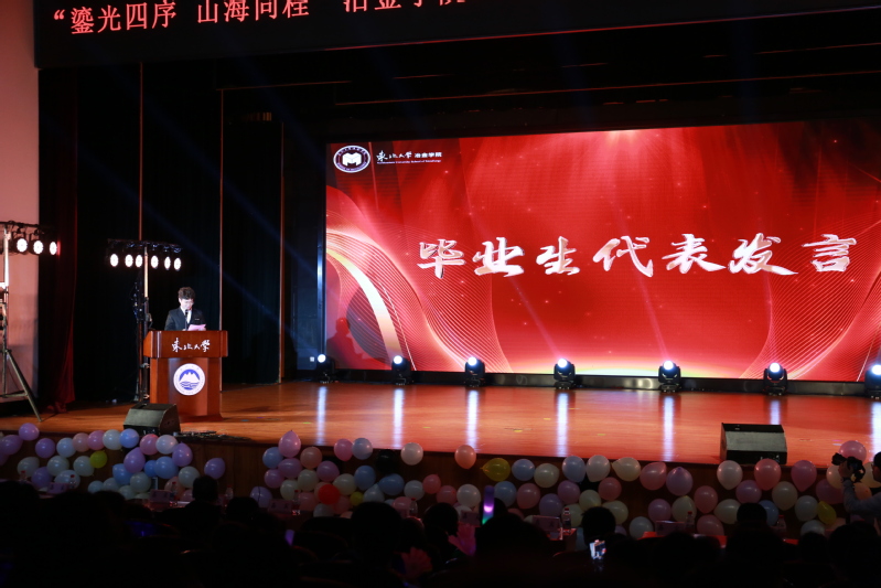 张峻浩同学作为毕业生代表发言,他代表全体毕业生向母校致以最诚挚的谢意,向老师表达最衷心的感激,向朝夕相处、并肩奋斗的同学们送上最真挚的祝福。承诺全体毕业生会以东北大学为荣,以冶金人的身份为荣,在各自的岗位上脚踏实地、努力拼搏,用实际行动书写属于我们的青春华章。