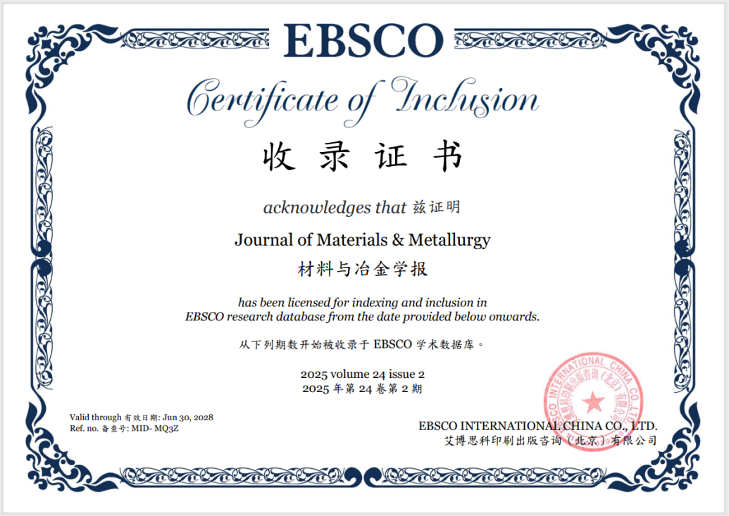 近日,《材料与冶金学报Journal of Materials and Metallurgy)编辑部收到美国EBSCO学术数据库收录证书,意味着本刊经过国际评委严格评审、遴选后被这家权威数据库正式收录,收录起始时间为2025242。这是继被日本JST英国EuroPub美国CA、俄罗斯AJ等国际知名数据库收录后,材料与冶金学报在国际化发展道路上取得的又一新进展
