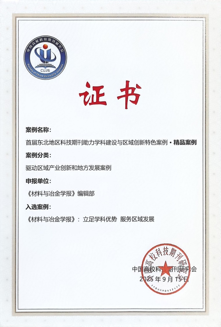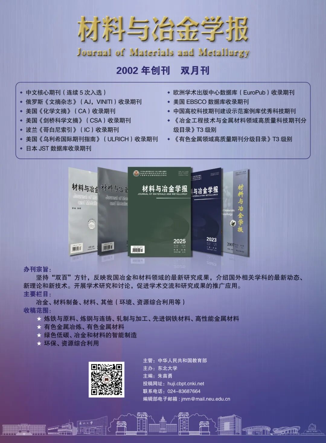 《材料与冶金学报》于2002年创刊,双月刊,由中华人民共和国教育部主管、东北大学主办,朱苗勇教授担任主编,主要刊登冶金资源高效利用、高性能金属材料制备、冶金过程感知与智能优化、绿色低碳冶金等方向的原创研究论文和综述。现为中文核心期刊,并被俄罗斯《文摘杂志》(AJ)、美国化学文摘社(CAS)、美国《剑桥科学文摘》(CSA)、波兰《哥白尼索引》(IC)及哥白尼索引精选数据库(ICI Journals Master List)、美国《乌利希国际期刊指南》(ULRICH)、日本JST数据库、欧洲学术出版中心数据库(EuroPub)、美国EBSCO数据库等多个国际数据库收录。