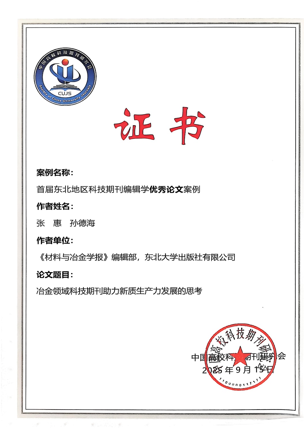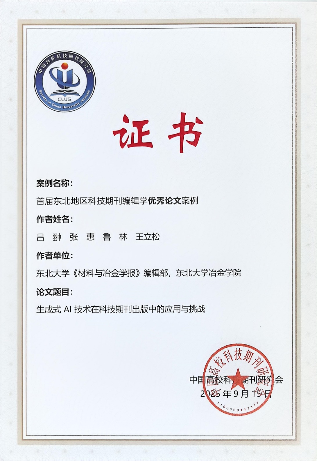 会议公布了“首届东北地区科技期刊助力学科建设与区域创新”特色案例和编辑学论文案例。《材料与冶金学报》成功入选“驱动区域产业创新和地方发展·精品案例”,编辑部两位编辑吕翀、张惠所撰写的论文分别入选“编辑学优秀论文案例”。