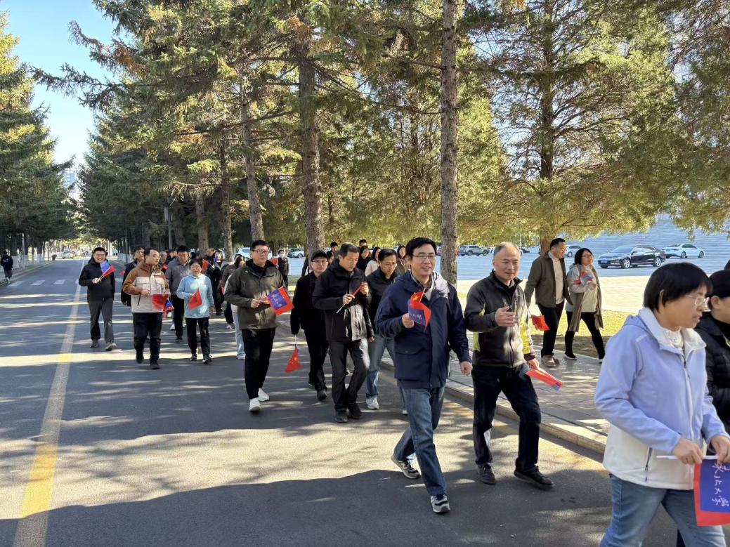 本次健步行活动以冶金学馆为起始点,途经学校南门、沈水湾公园、云飏阁等。教职工健步行队伍挥舞着旗帜,在秋日暖阳下一路欢声笑语。