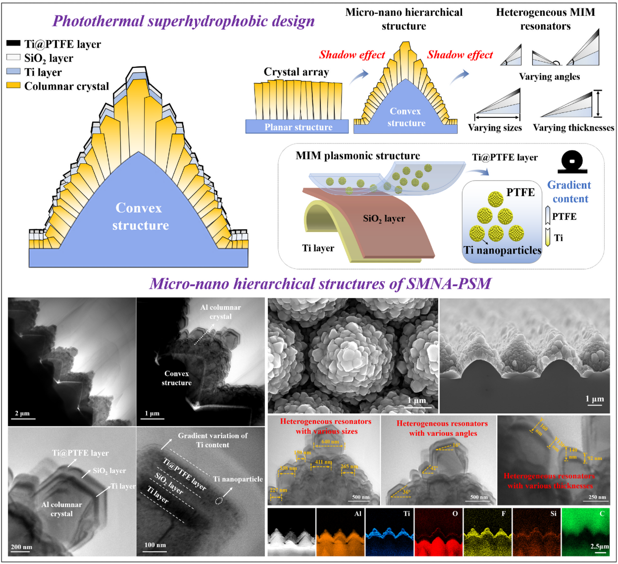 本研究提出了一种用于防冰/除冰的高性能结构化微纳晶体阵列光热超疏水超材料。这种结构化晶体阵列具有丰富的微纳表面,可将沉积的金属-绝缘体-金属(MIM)谐振器转变为异构谐振器。这些具有不同尺寸、角度和厚度的异构谐振器可提供更多的电磁波响应位点和散射表面,能将均匀MIM结构中离散的吸收位点转化为连续的吸收带,从而使其实现高达96%的太阳光谱吸收率。此外,通过调整沉积材料,晶体阵列的表面形态就可以从光滑变为粗糙,从而实现从疏水性向超疏水性的转变。与传统的微纳分级结构不同,结构化微纳晶体阵列可以与薄膜堆叠架构集成,兼具膜系材料的优势,如性能可调、均匀性好、基底兼容性佳及可扩展性强。这种方法在微纳结构制造、宽带电磁波吸收、润湿性控制、光热转换及防冰/除冰等领域展现出了广泛的应用潜力。