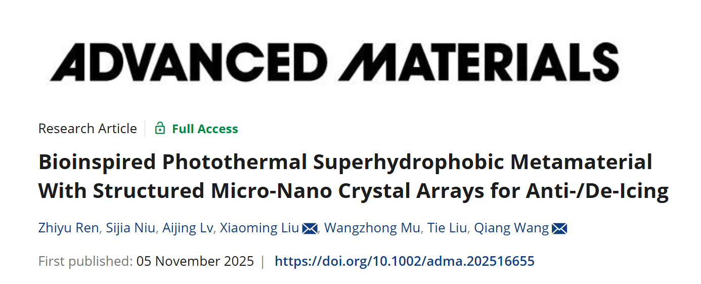 近日,东北大学王强、刘晓明团队在光热超疏水超材料领域取得重要进展。相关成果以“Bioinspired Photothermal Superhydrophobic Metamaterial With Structured Micro-Nano Crystal Arrays for Anti-/De-Icing”为题发表在国际权威学术期刊Advanced Materials(影响因子26.8)。东北大学为该论文的第一作者单位,东北大学冶金学院博士研究生任志宇为第一作者,刘晓明副教授与王强教授为共同通讯作者。