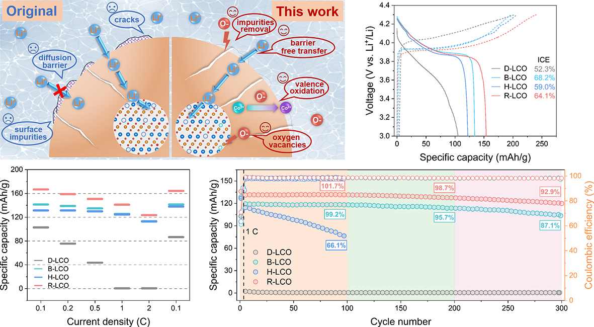 该团队提出了一种基于氧自由基(O⁻)辅助的结构修复策略以实现失效钴酸锂(LiCoO2)正极的高性能直接再生。通过在传统水热过程中引入H2O2并在后续退火中进行Ti4+掺杂,成功清除了电极表面的有害杂质与尖晶石相Co3O4。由O−诱导产生的表面氧空位促进了Li+的补充与后续Ti4+的均匀掺杂,Ti4+作为结构支柱,提高了电化学过程中的结构稳定能力,实现了正极材料层状结构的完整修复与电化学性能的高效再生。团队通过选用绿色试剂H2O2,使用简单的水热退火工艺,同步实现了尖晶石相的高效转化、表面杂质的清除和裂纹的修复,同时促进表面氧空位的形成,为后续Ti4+掺杂降低了扩散能垒。而Ti4+的均匀掺杂则提高了再生材料的结构稳定性,有效抑制了充放电过程中的结构退化与有害相变。再生后的LiCoO2正极材料在1.0 C倍率下展现出141.1 mAh g−1的高可逆容量,300次循环后容量保持率高达92.9%,性能优于原始商业材料。该策略为退役电池正极材料的高值化回收与再利用提供了一条简便、经济且无污染的新方案。东北大学分析测试中心为数据采集和表征工作提供了重要支撑。