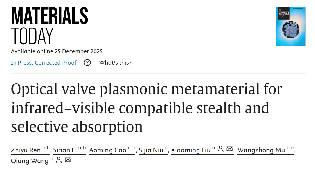 近日,东北大学王强、刘晓明团队在外场辅助制备金属基电磁吸收材料领域取得重要进展,相关成果以“Optical valve plasmonic metamaterial for infrared-visible compatible stealth and selective absorption”为题发表在国际权威学术期刊Materials Today(影响因子22)。东北大学为该论文的第一完成单位,冶金学院博士研究生任志宇为第一作者,刘晓明研究员与王强教授为共同通讯作者。