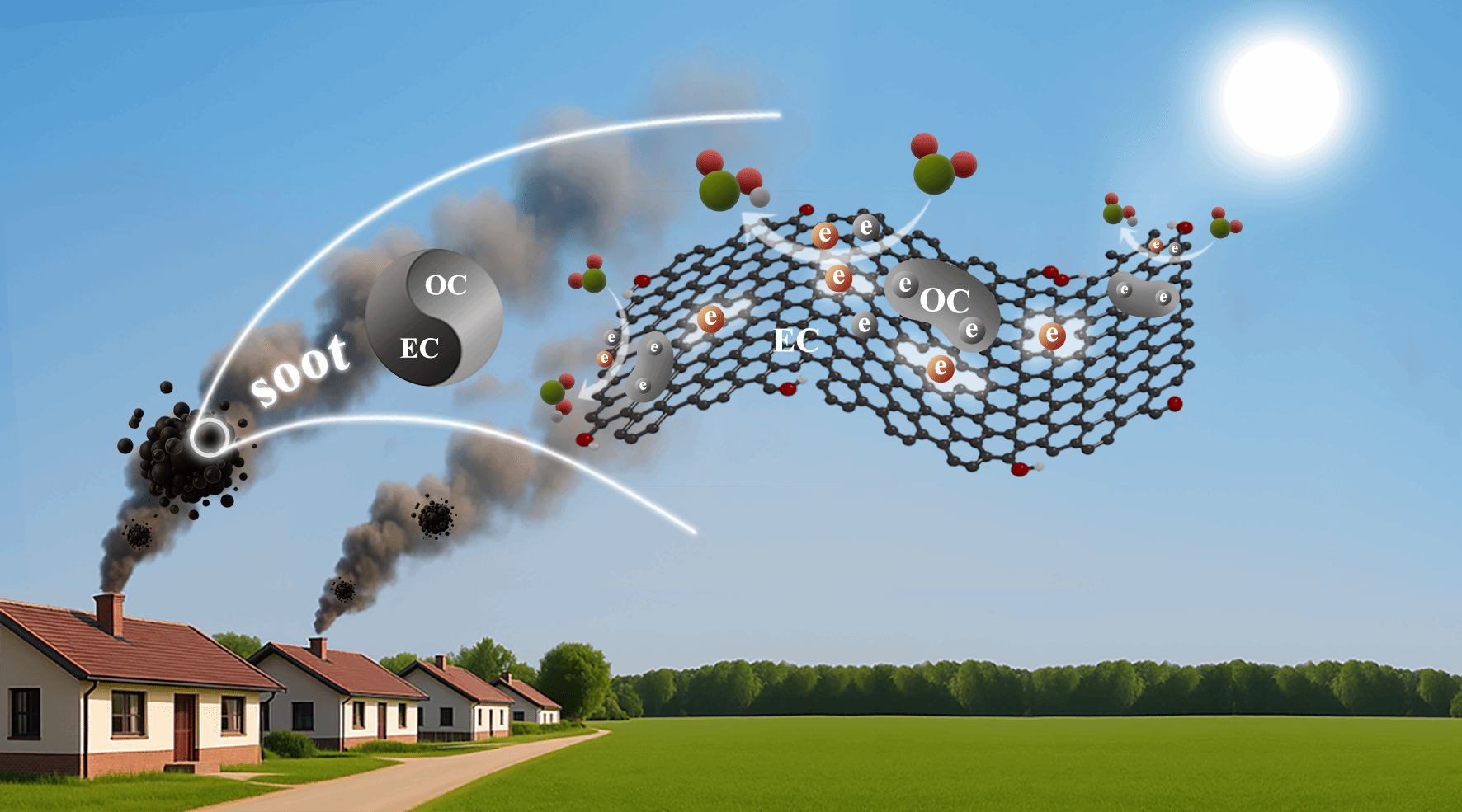 HONO光解是大气中•OH的重要来源,而•OH作为大气氧化过程的核心活性物种,能够促进二次污染物生成并加剧空气质量恶化。黑碳界面NO2光化学还原被认为是大气中HONO的重要来源。由于黑碳的组成和微观结构极其复杂,其在NO2光化学转化生成HONO过程的具体作用机理仍缺乏清晰认识。本研究通过耦合动力学分析、光电化学表征、微观结构解析及量子化学计算,系统揭示了典型生物质燃烧源排放的黑碳与NO2光化学反应生成HONO的机理。研究结果表明,NO2摄取系数、HONO生成通量与黑碳表面光生电子强度呈现显著线性正相关,证实NO2向HONO的光化学转化受电子传递过程主导。黑碳微观结构分析表明,较大的石墨层弯曲度和较短的条纹长度有利于暴露NO2还原的活性位点。石墨层边缘和表面缺陷是光生电子的关键结构区域,含氧官能团作为电子传输通道,促进电子向NO2的高效转移。黑碳的元素碳与有机碳可以形成II型异质结,驱动电子定向迁移并有效抑制电子–空穴复合,进一步提升HONO生成效率。该研究建立了黑碳微观结构、光生电子与反应活性之间的量化关系,为深入理解大气环境中黑碳的反应活性及其环境效应提供了重要科学依据。