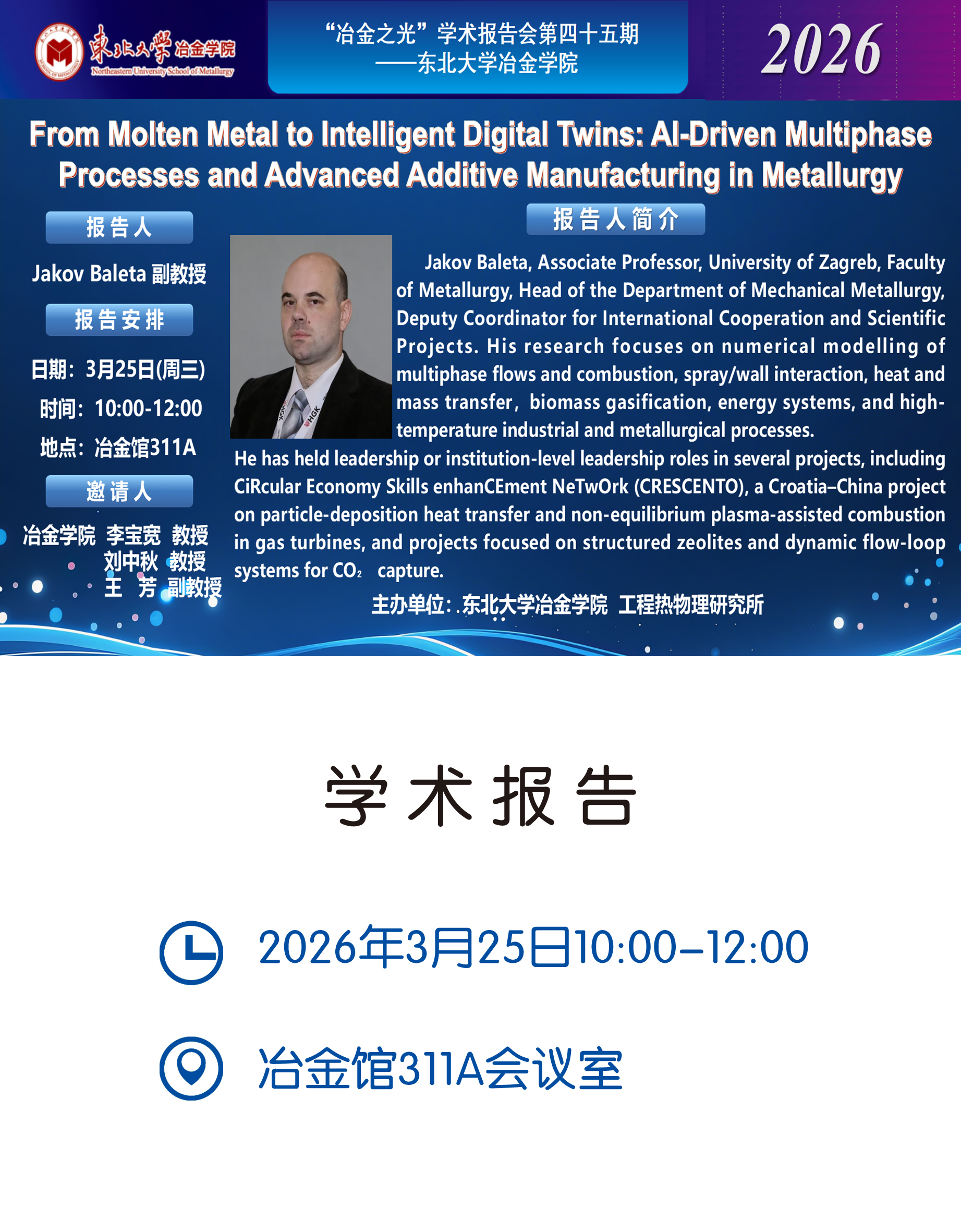 3月25日,克罗地亚萨格勒布大学冶金学院副教授Jakov Baleta访问东北大学冶金学院李宝宽教授课题组,并做客东北大学冶金学院“冶金之光”学术报告会第四十五期,作了题为 “From Molten Metal to Intelligent Digita...