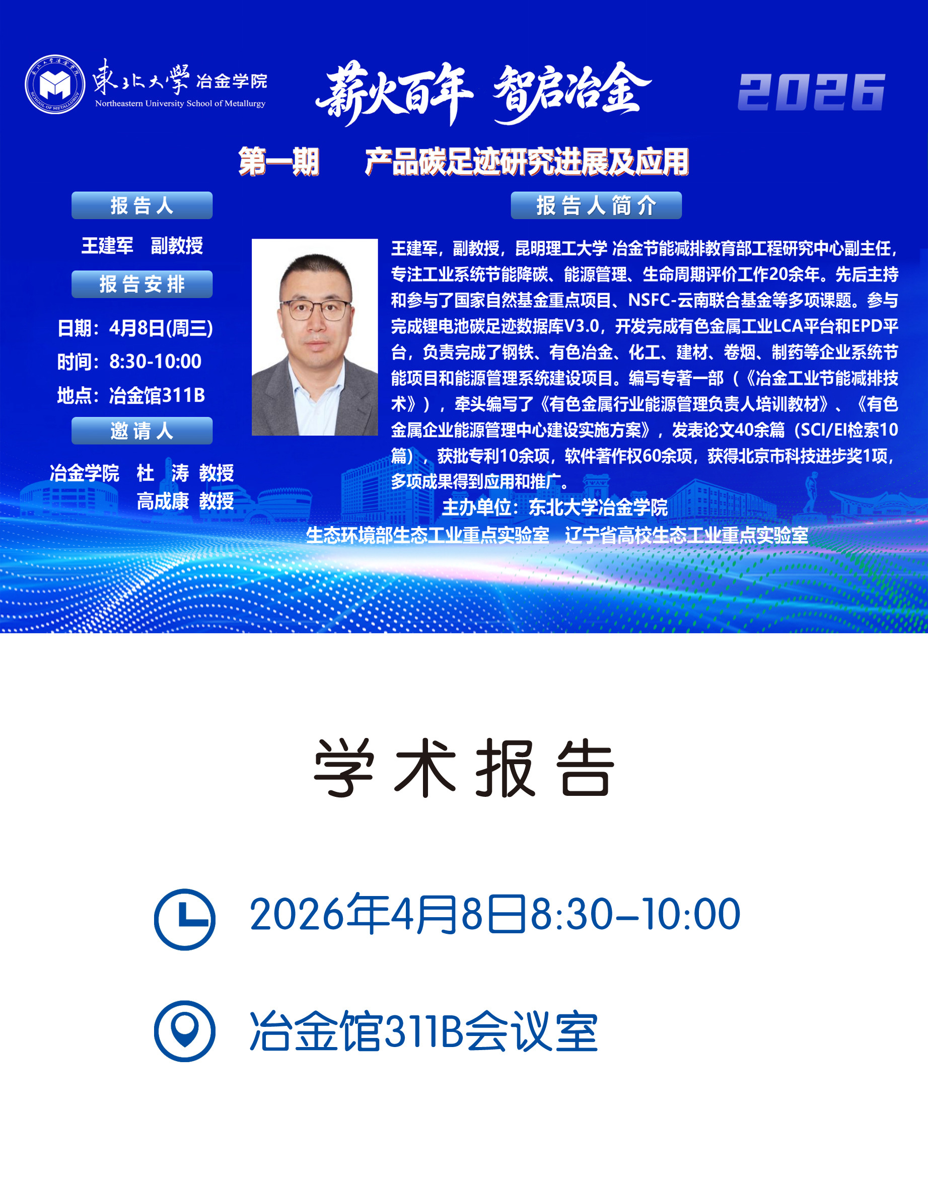 4月8日,应冶金学院杜涛教授和高成康教授邀请,昆明理工大学冶金节能减排教育部工程研究中心副主任王建军老师做客东北大学,并应邀作“产品碳足迹研究进展及应用”专题报告,报告会由高成康教授主持并致欢迎辞。本次...