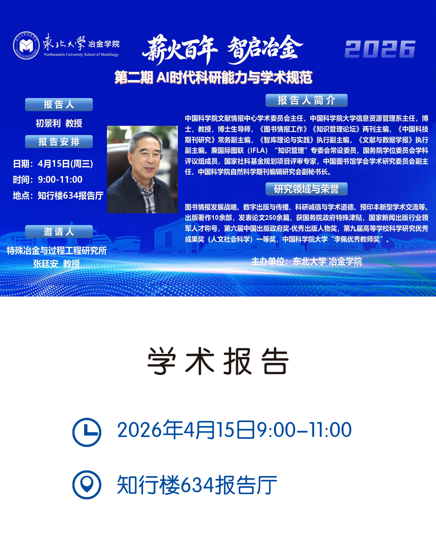 4月15日,中国科学院文献情报中心学术委员会主任、中国科学院大学初景利教授应东北大学冶金学院特殊冶金与过程工程研究所张廷安教授邀请,作题为“AI时代科研能力与学术规范”的专题学术报告。本次报告由张廷安主...